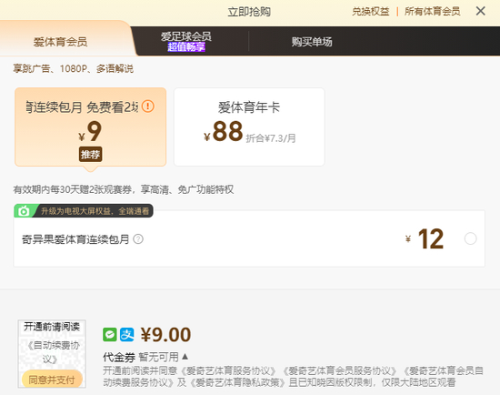 此外,该客服人员还向记者解释到,如果爱体育会员用户已经使用掉当月赠送的观赛卷,也只要花费8元即可观看本场比赛。而对于开通连续包月后是否会存在自动扣费等问题,对方也表示扣费前会有短信通知,“仅想观看本场比赛的用户也可以在购买连续包月后即可取消该权益。”