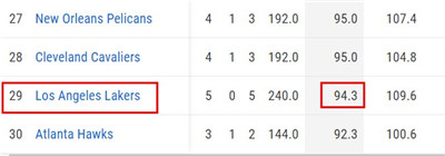 进攻第29+防守第25!湖人5连败拉响警报:场均输掉17.2分