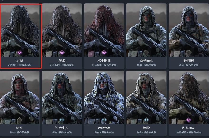 沼泽。这是一款史诗级别的皮肤,不过和之前提到的皮肤不一样的是,它给人的感觉更像一个只为金钱战斗的雇佣兵。人物身穿一身吉利服,直接将面部全部遮住,让别人无法看清楚他的面部表情,让人感觉更加的神秘,仿佛像是有一条毒蛇在注视着你,让人不寒而栗。