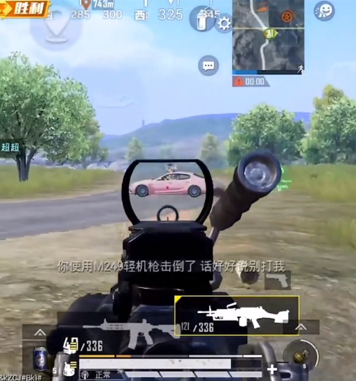 这局比赛槿夕和队友一起开着最新款的阿斯顿马丁载具寻找转移信号圈,却在半路遇到了旁边的一个满编车队,双方隔空对视“你瞅啥”“瞅你咋地”,于是就有了接下来的战斗。