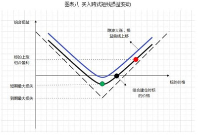 买入跨式组合短线变动还需将波动率的影响纳入考虑范围,波动率的变化对期权合约价格的影响可以用vega值衡量。当隐含波动率上升时,对买入跨式组合有利,在图表八中,隐波上升,组合短线收益随之上升;反之,隐波下降,组合短线不利。