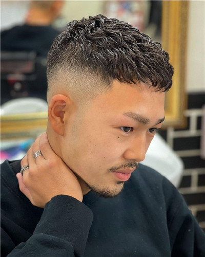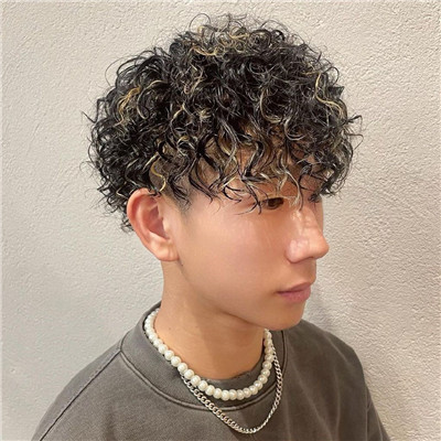 男士烫发一般会选择把周边推短,头顶进行烫发的处理,这样既能避免周边头发的乱翘,又能突出时尚感。