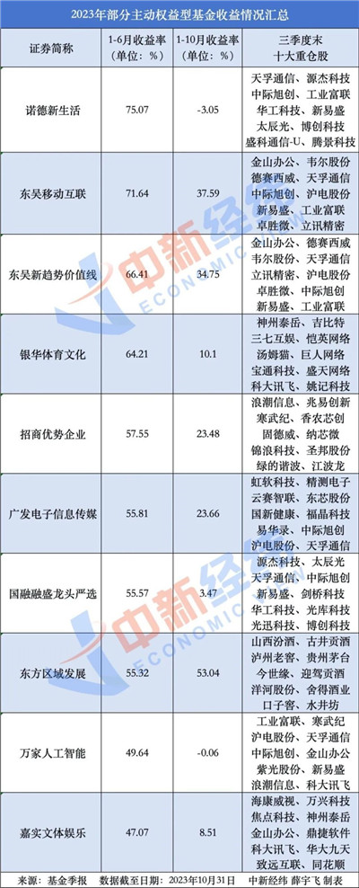 银华体育文化此前主要投资文化、传媒、游戏等个股,从2023年一季度开始,“重点投资科技创新的应用环节,主要投资传媒和计算机。”在上半年,该基金取得64.21%的年内收益率,但截至10月31日,年内收益率已经降到10.1%,降幅超过50个百分点。