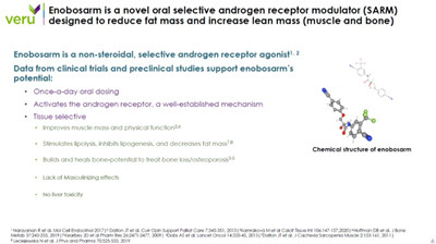 Veru公司的在研疗法enobosarm是一款选择性雄激素受体调节剂(SARM),通过激活雄激素受体,它具有增加肌肉质量和生理功能,刺激脂质裂解和抑制脂肪生成的作用。该公司计划开展一项2b期临床试验,评估enobosarm与司美格鲁肽或tirzepatide联用,在降低体重同时保存肌肉质量的效果。
