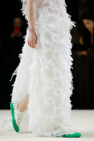 系列中大量的弧线廓形,从肩部到身体的不同部位,流畅清晰地展现了服装的雕塑感与流动性。真正能为我们带来方向感的,正是生命的流动,它如水流般奔走涌动,遇上岛屿礁石,激起朵朵浪花,落在土里成了棉花,飘在空中成了云朵……
